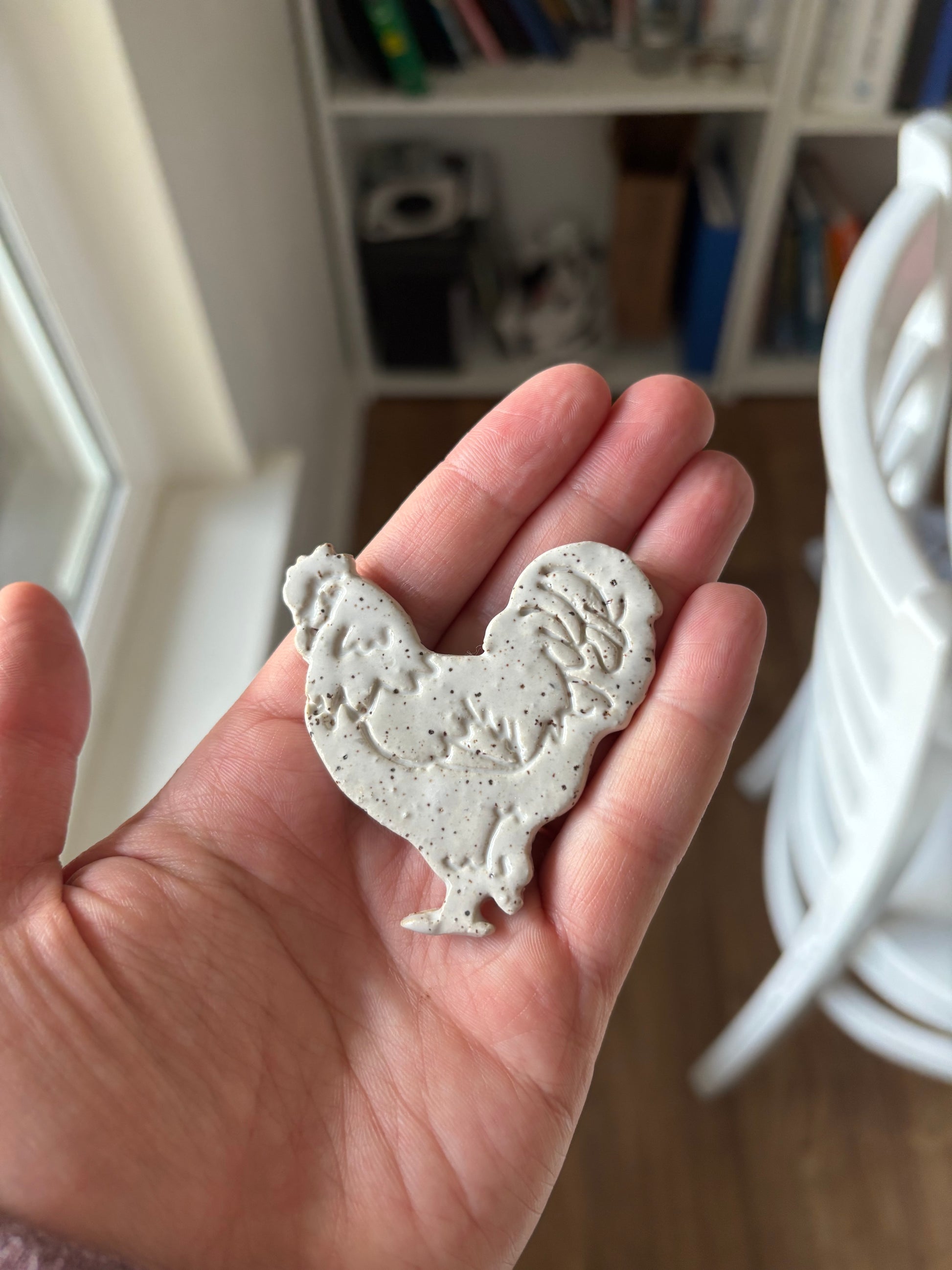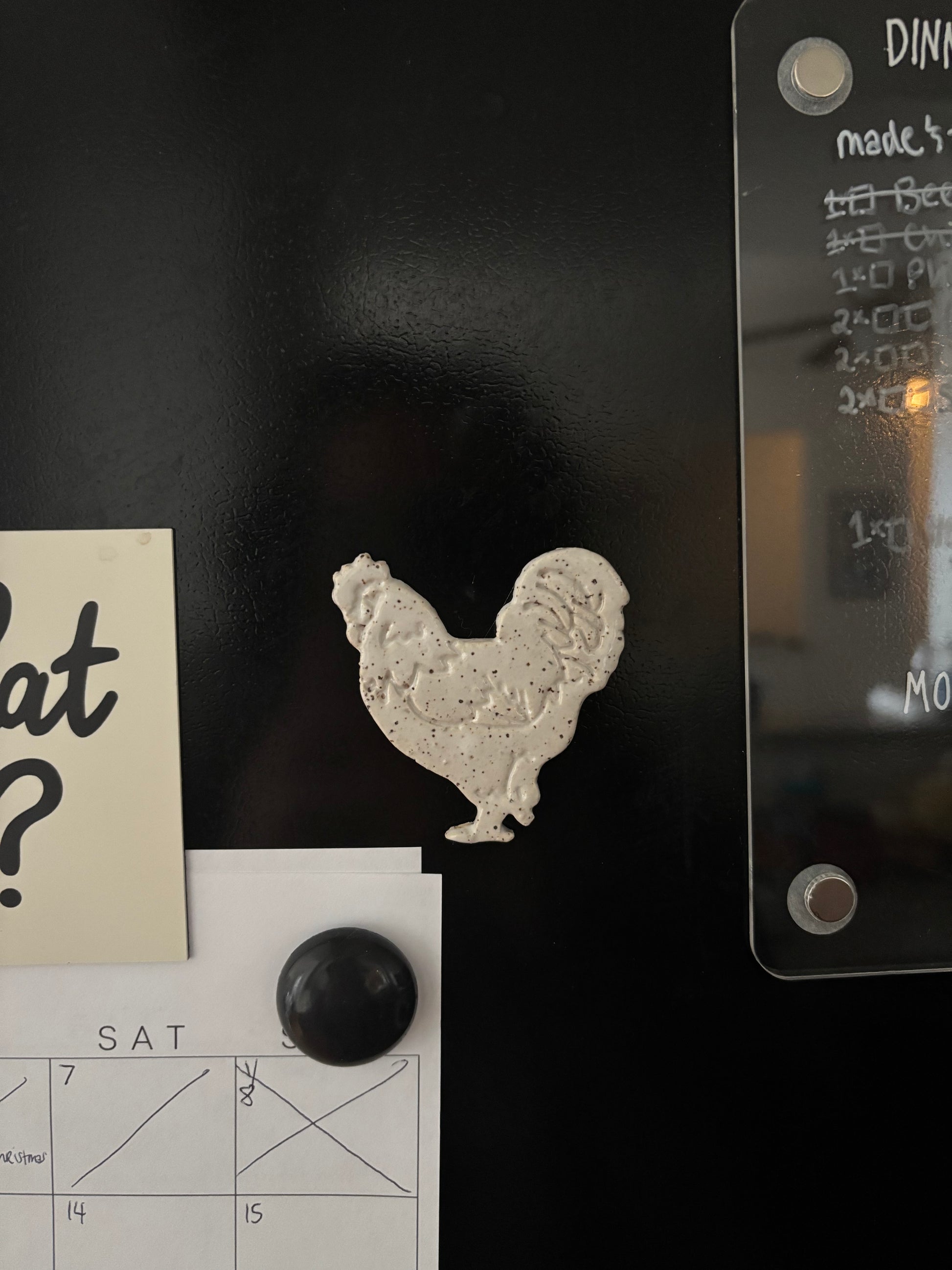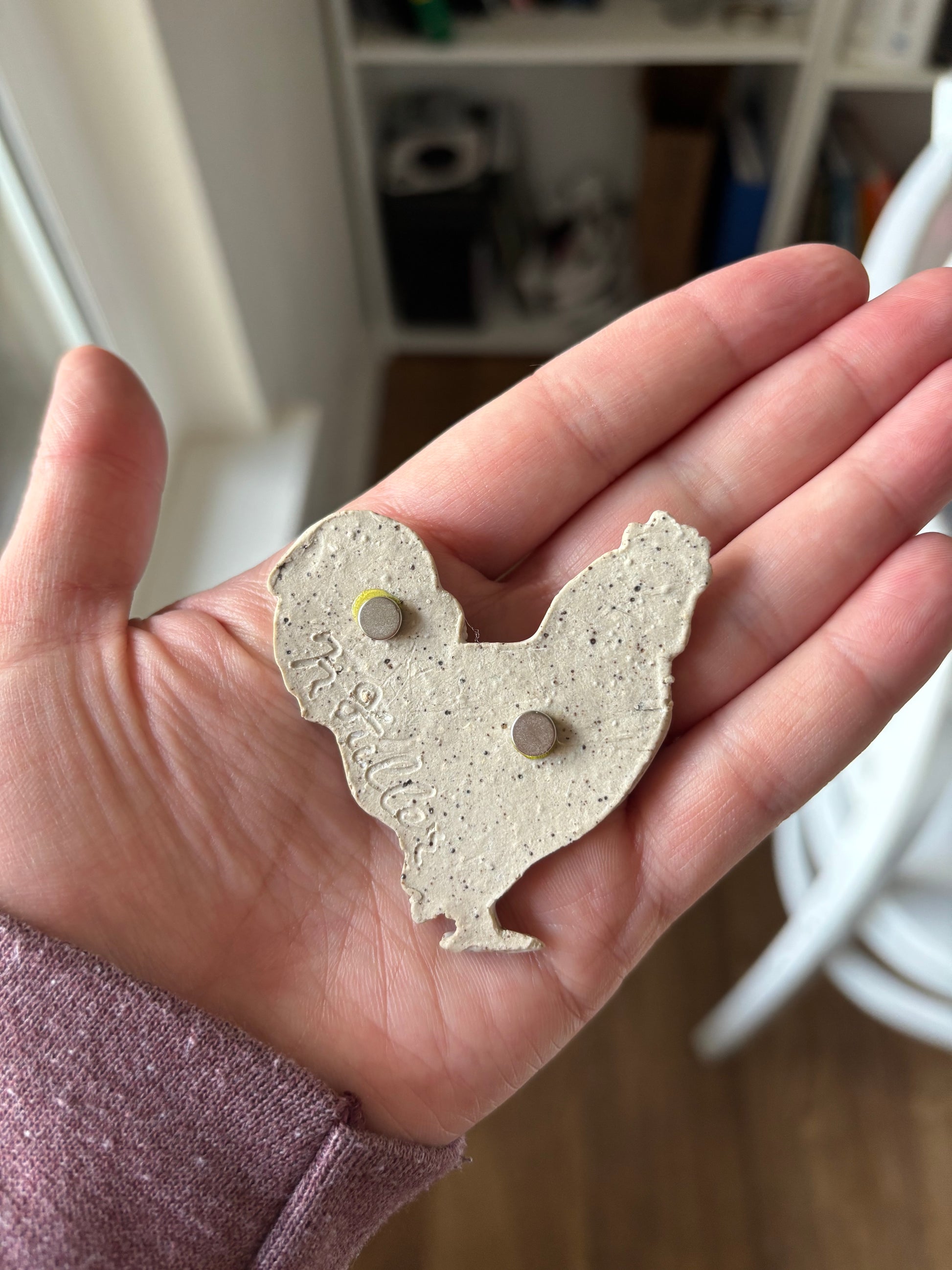 “Helen” and “Maya” Speckled White Chicken Magnets